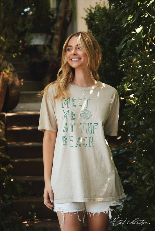 MEET ME AT THE BEACH Oversized Mineral Washed Graphic Top : CREAM