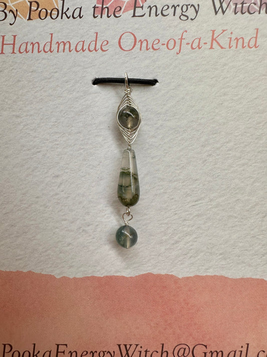 Pooka the Energy Witch - Sterling Silver Wire Wrap Pendant - Moss Agate Oblong - Virgo, Gemini