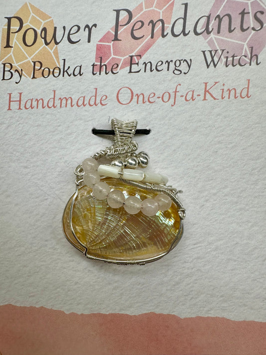 Pooka the Energy Witch - Wire Wrap Pendant - Iridescent Shell with Sterling Silver Wire Wrap and Ornate Beads