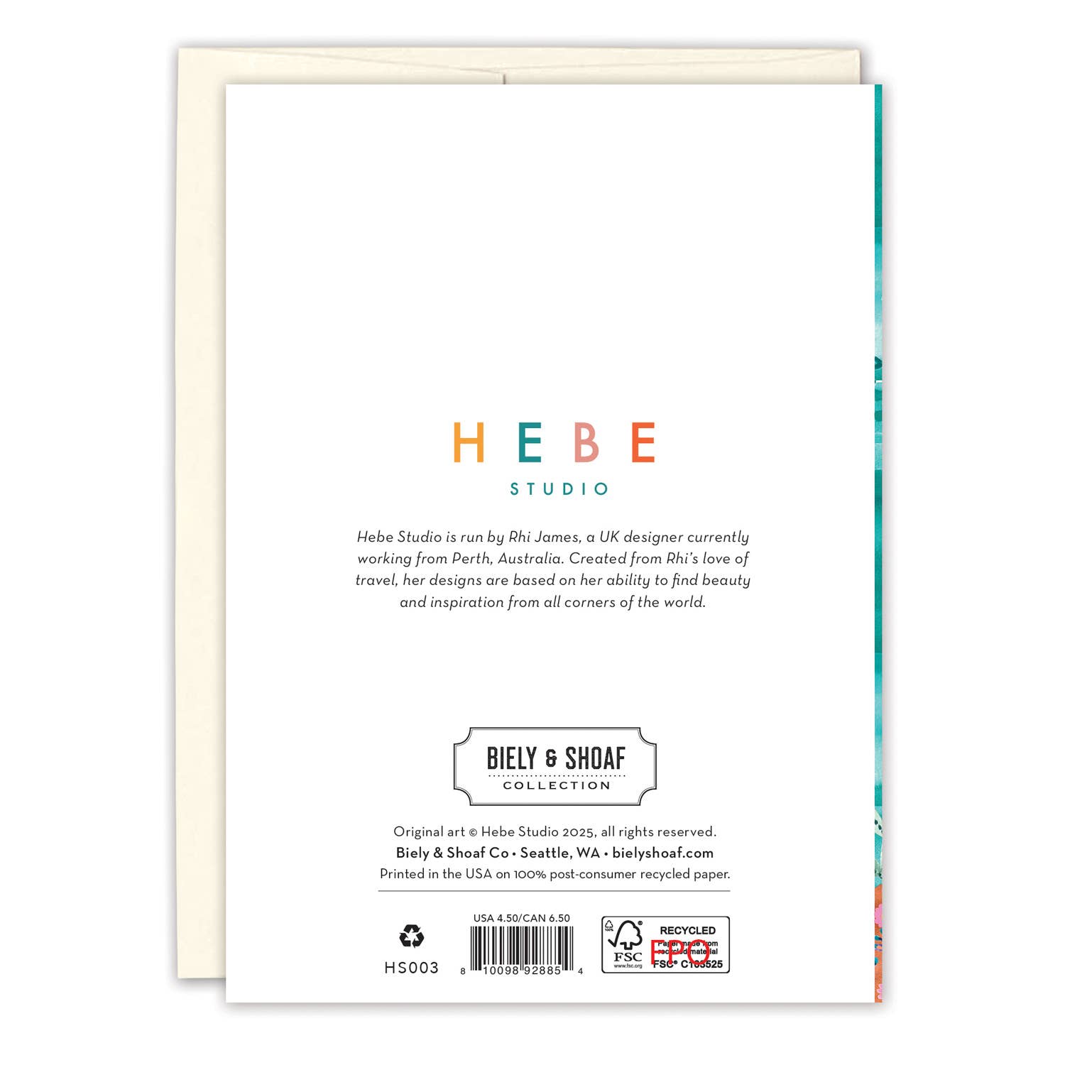 Inside verse: Wishing you a beautiful day and a bright year ahead. • Gold foil details • Illustrated by Rhi James • Size: A6, 4.5" x 6.25"