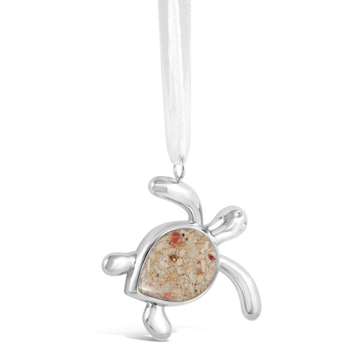 The turtle, a symbol of longevity, wisdom, and perseverance, is beautifully captured in this customizable ornament. Made from recycled stainless steel, it features a serene expression and a shell handcrafted with your choice of sand or earth element. Capture your favorite beach day or a vacation you can't wait to take with an element from our Sandbank, or send your own for a truly special keepsake.