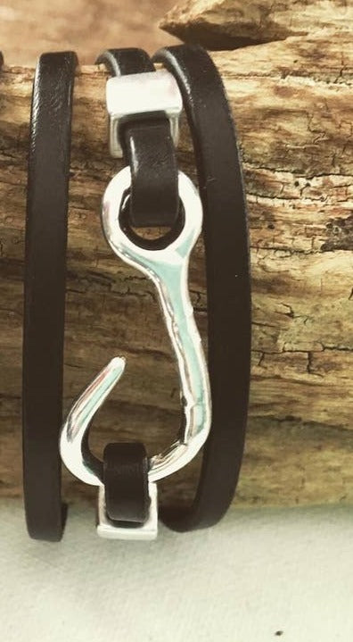 Fish Hook leather wrap bracelet in black leather. This bracelet is unisex, it wraps around the wrist 3 times, or it can be worn around the ankle.