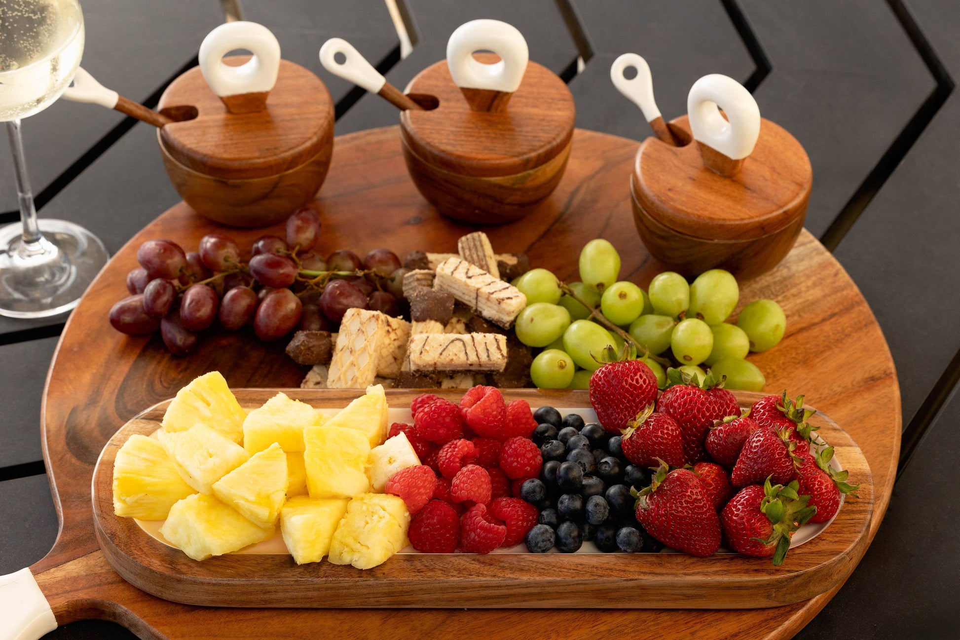 Dip in style. Perfect for serving an assortment of snacks or an array of condiments, this set of 3 Acacia wood and white enamel bowls offer a stylish way to serve your guests. This versatile dip set combines two entertaining essentials, our wood + white tray and complimentary bowls with spoon, spreader, and honey dipper. Ideal for storing and serving condiments such as sea salt, cayenne pepper, garlic salt, and coriander as well as small appetizers, honey, and dips such as salsa, guacamole, olives, sauces, dressings, or candy.