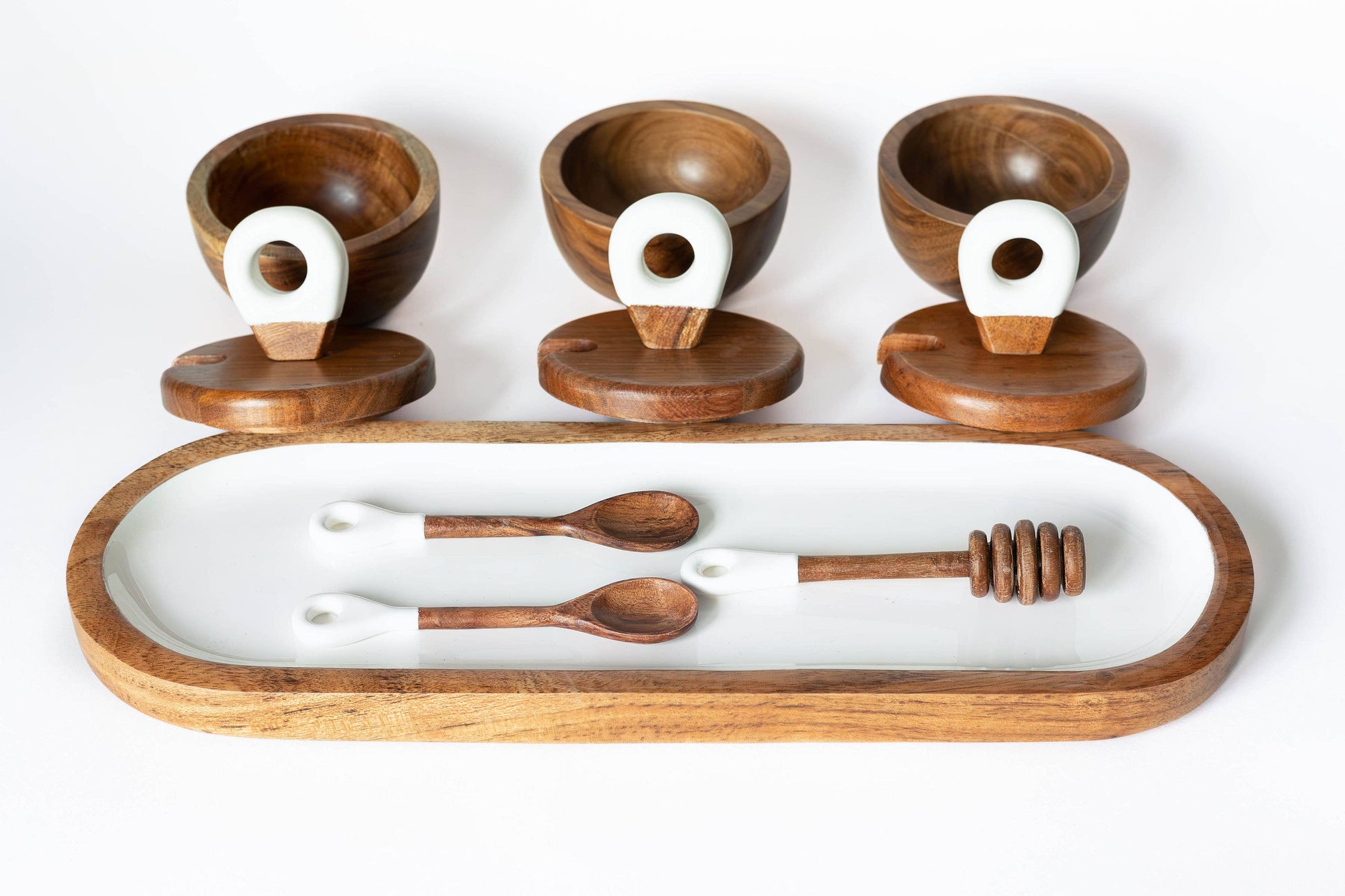 Jeanne Fitz - Wood + White Acacia Wood 3 dipping bowls, tray, and spoons