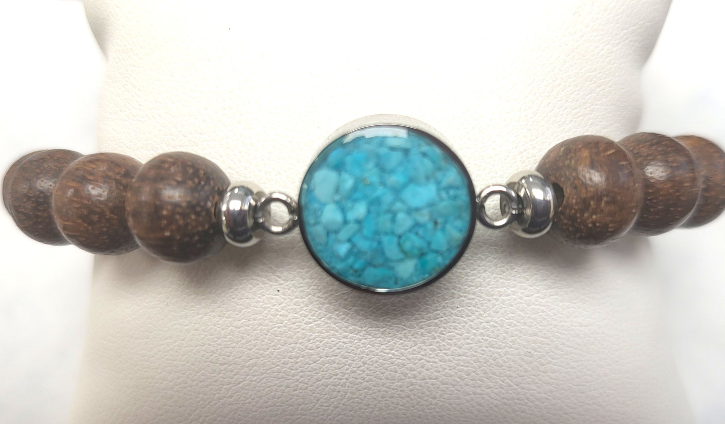 A gift as unique as the guy in your life! Dune Jewelry's Men's Wood Bead Bracelet is a handsome reminder of his most important memories. Rich Eagle Wood Beads join with a Stainless Steel bezel handmade with your choice of sand or earth element.