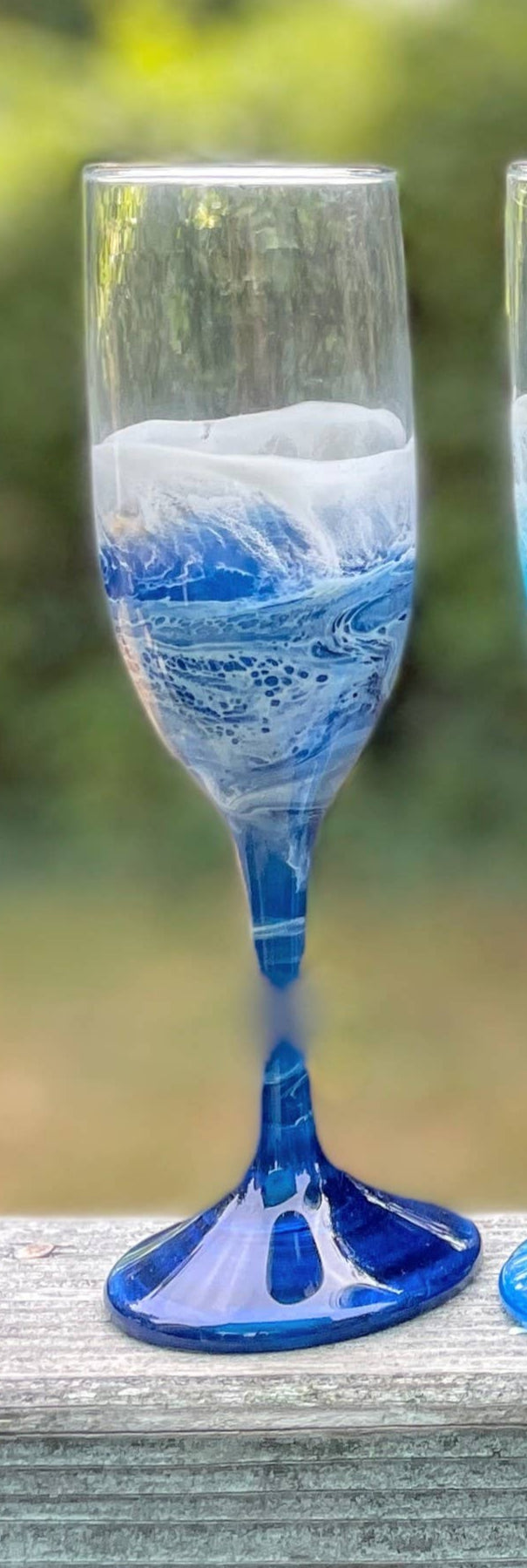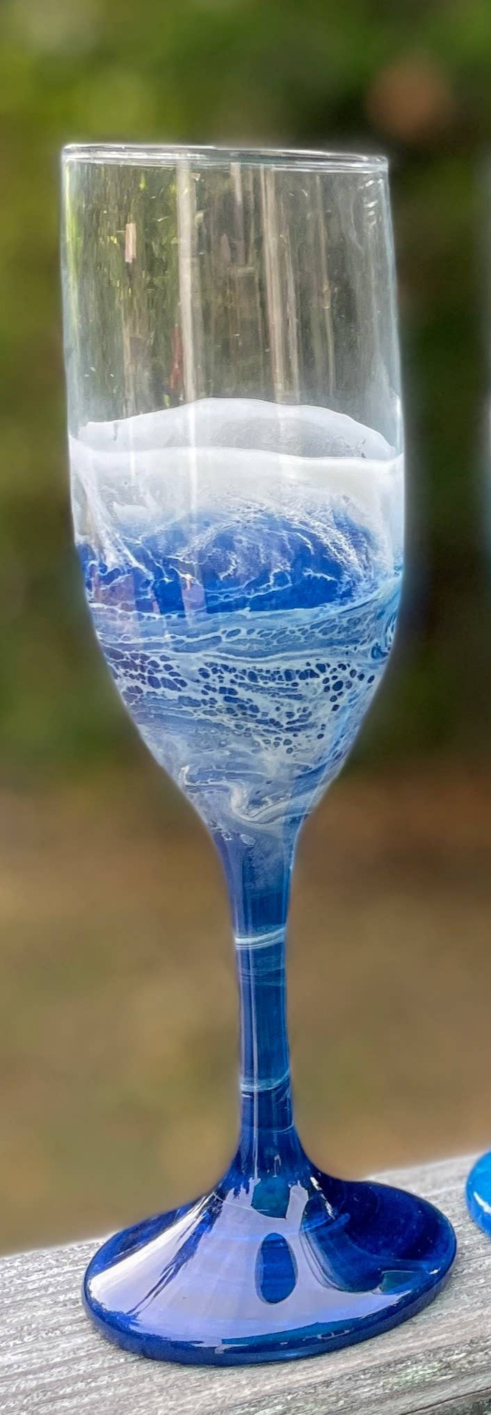 These beautiful champagne flutes feature a one-of-a-kind masterpiece with a mesmerizing, food-safe resin ocean-wave design. Each glass is unique, and no two are exactly alike. Please remember that these champagne flutes should only be hand-washed to preserve their artistry. Dimensions: Width: 2.55 in Height: 8.036 in Length: 2.55 in Volume: 6.25 oz