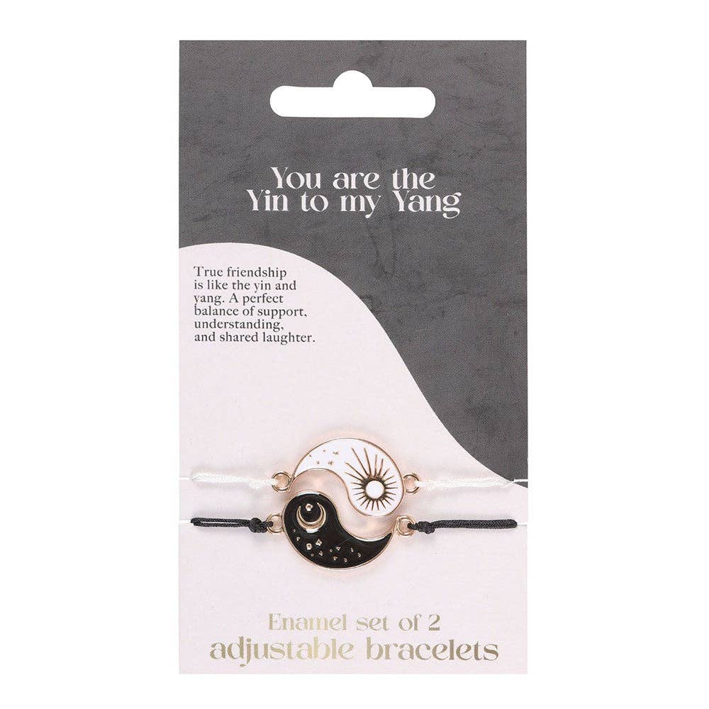 Celebrate the harmony of opposites with this pair of Yin and Yang bracelets, designed to be shared between two friends. Split between a sun and moon, this symbolic duo represents the balance of light and dark, a reminder that "You are the Yin to my Yang." Nickel-free stainless steel charms. Adjustable fit.