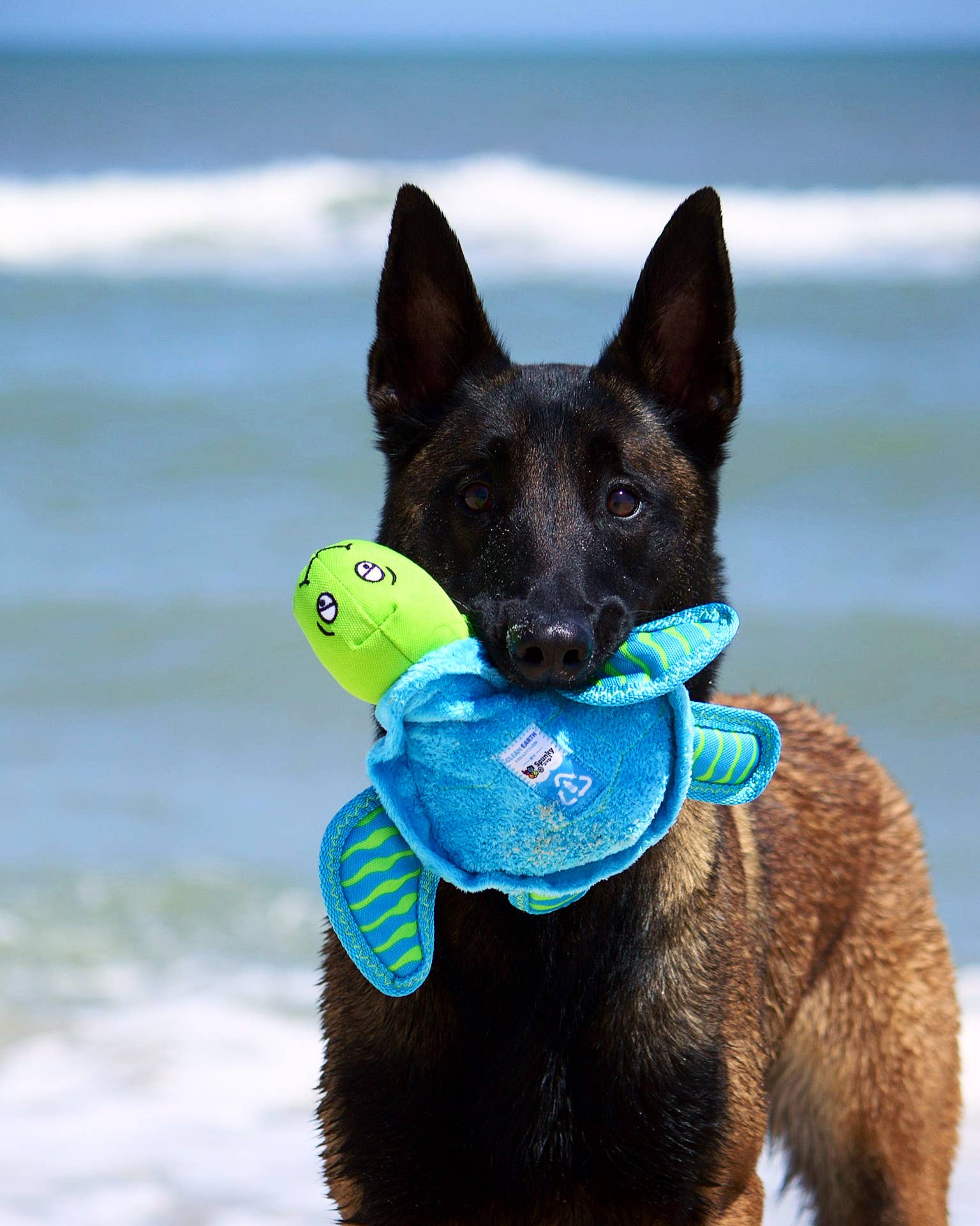 Now you and your dog can help remove waste plastic from the environment … one toy at a time! Clean Earth plush toys are made from 100% Recycled plastic water bottles, including the fabric, stuffing, binding and thread. Each toy redirects waste from up to 9 plastic water bottles from ending up in oceans, waterways and landfills. Clean Earth plush toys includes a built-in squeaker and durable construction. Not only are Clean Earth toys recyclable, but each toy can be recycled when you dog is done playing with it … which means Infinite Loop Recycling!
