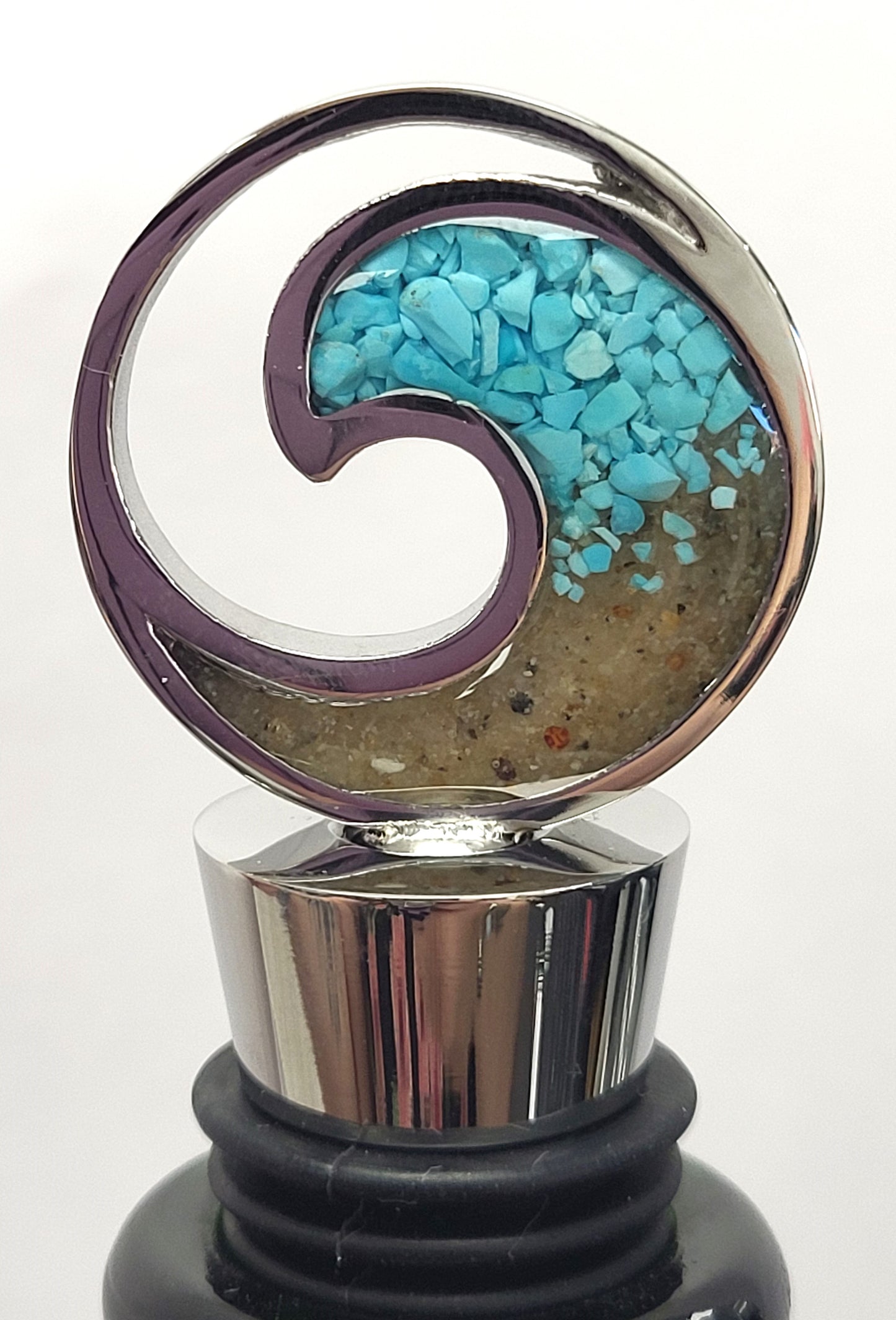 Uncork coastal vibes. The Wave Wine Stopper combines elegance and functionality. Handcrafted with stainless steel, it keeps your wine fresh while adding a touch of ocean breeze to your table. Quality stainless steel construction. Layered to a slightly domed, glass-like finish. Handmade with Love & Sandy Hands in the USA®